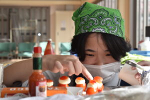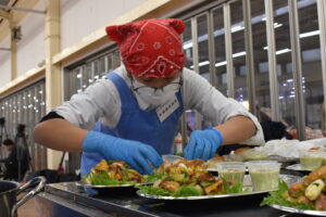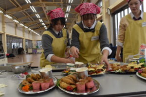 県内4校(鳥取湖陵高校、智頭農林高校、倉吉農業高校、日野高校)から各4人が出場し、生徒が考案したレシピの調理を競いました。課題メニューは、「地元野菜のクリスマスパーティーメニュー」。県産肉、ブロッコリー、ねばりっこなどの県産農畜産物を使用し、90分間の調理時間で各チームが声を掛け合いながら、おいしく、見た目のよいオリジナルメニューを完成させました。